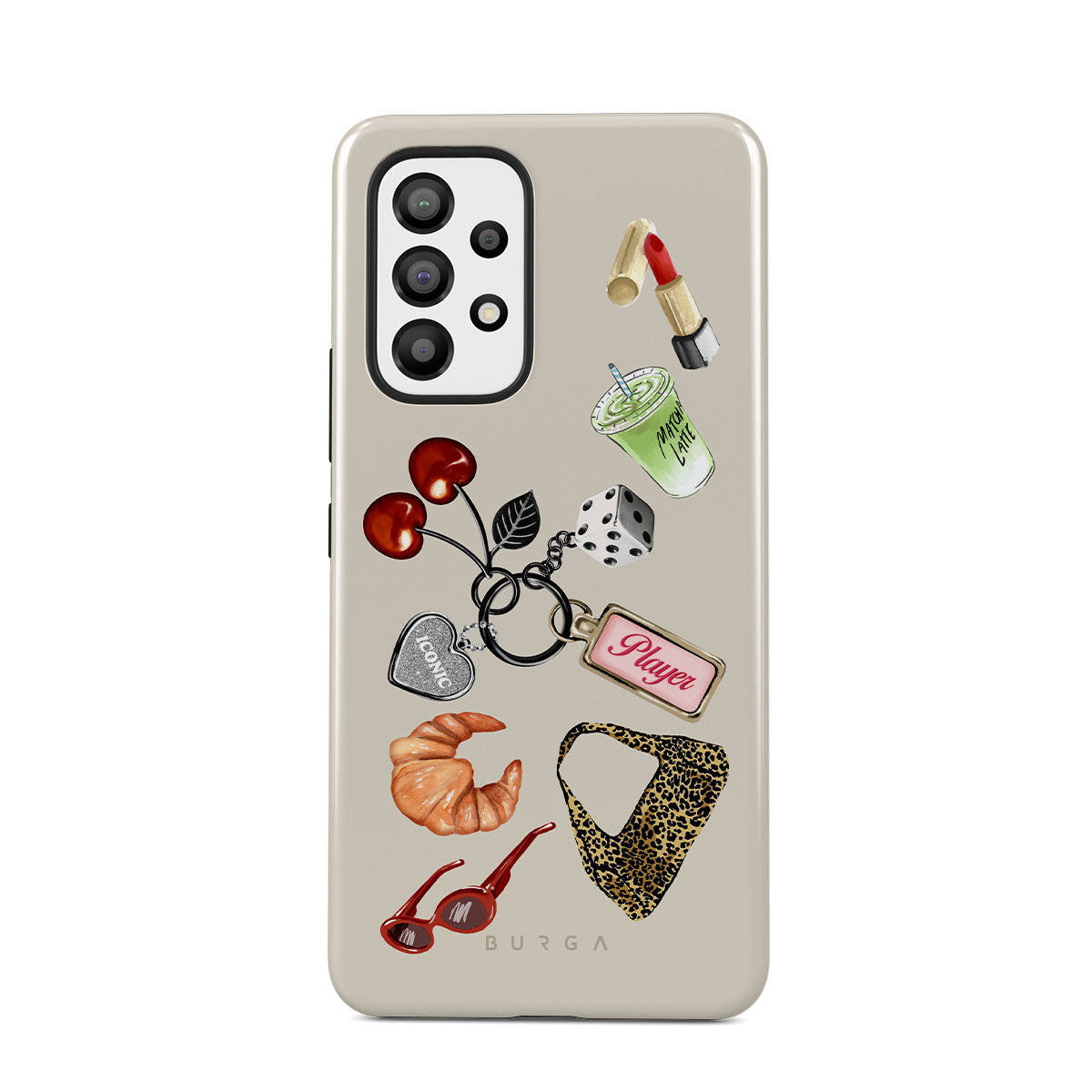 En este diseño: lentes de sol rojas, pintalabios rojo, bebida de matcha verde, croissant, dados negros, bolso de estampado de leopardo, llavero con corazón plateado, cerezas, dados y etiqueta "Player".
