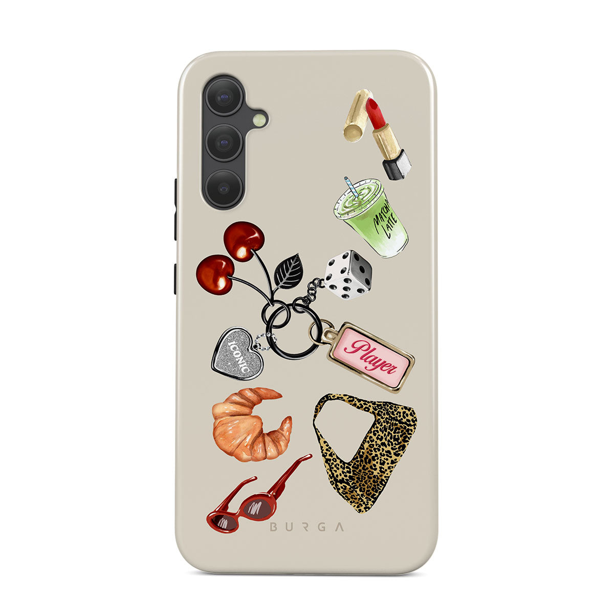 En este diseño: lentes de sol rojas, pintalabios rojo, bebida de matcha verde, croissant, dados negros, bolso de estampado de leopardo, llavero con corazón plateado, cerezas, dados y etiqueta "Player".
