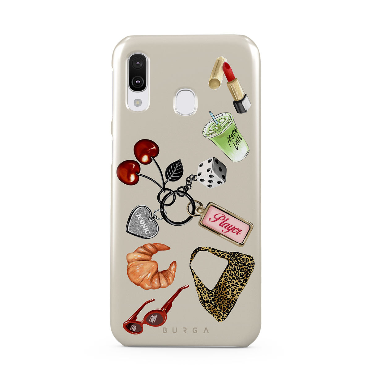 En este diseño: lentes de sol rojas, pintalabios rojo, bebida de matcha verde, croissant, dados negros, bolso de estampado de leopardo, llavero con corazón plateado, cerezas, dados y etiqueta "Player".