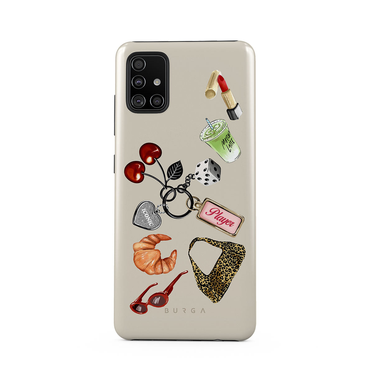 En este diseño: lentes de sol rojas, pintalabios rojo, bebida de matcha verde, croissant, dados negros, bolso de estampado de leopardo, llavero con corazón plateado, cerezas, dados y etiqueta "Player".
