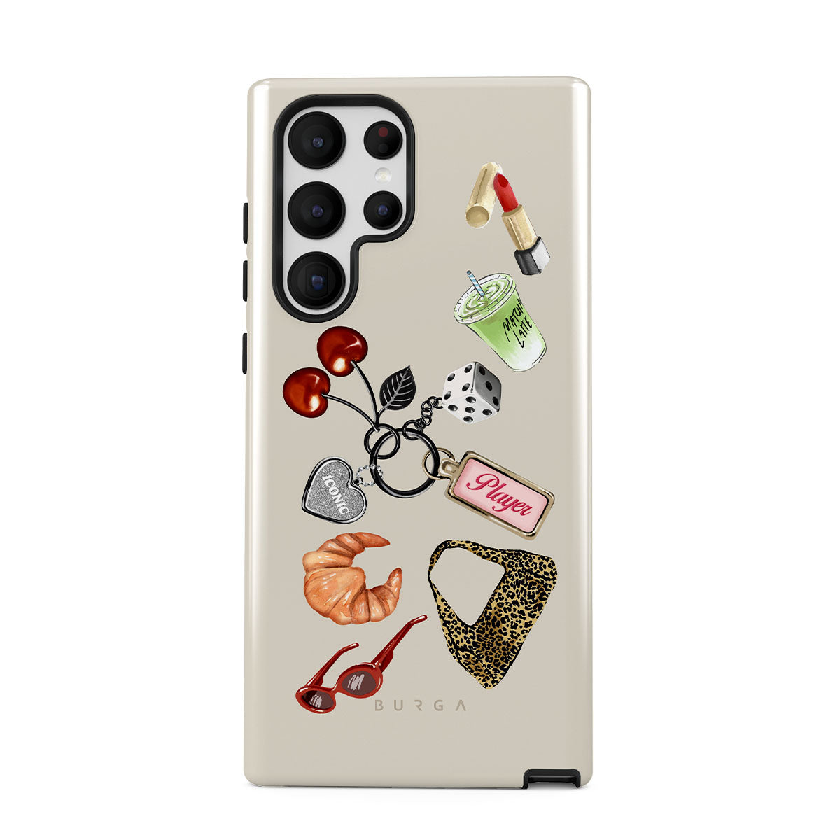 En este diseño: lentes de sol rojas, pintalabios rojo, bebida de matcha verde, croissant, dados negros, bolso de estampado de leopardo, llavero con corazón plateado, cerezas, dados y etiqueta "Player".