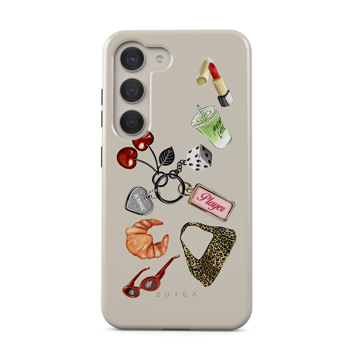 En este diseño: lentes de sol rojas, pintalabios rojo, bebida de matcha verde, croissant, dados negros, bolso de estampado de leopardo, llavero con corazón plateado, cerezas, dados y etiqueta "Player".
