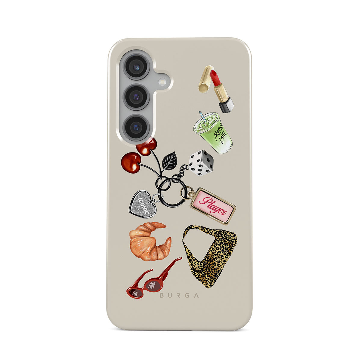En este diseño: lentes de sol rojas, pintalabios rojo, bebida de matcha verde, croissant, dados negros, bolso de estampado de leopardo, llavero con corazón plateado, cerezas, dados y etiqueta "Player".