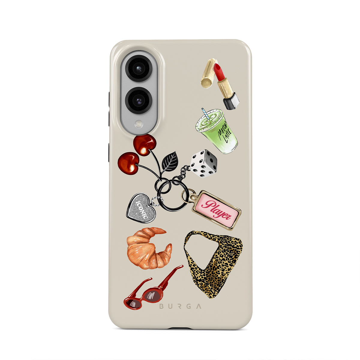 En este diseño: lentes de sol rojas, pintalabios rojo, bebida de matcha verde, croissant, dados negros, bolso de estampado de leopardo, llavero con corazón plateado, cerezas, dados y etiqueta "Player".