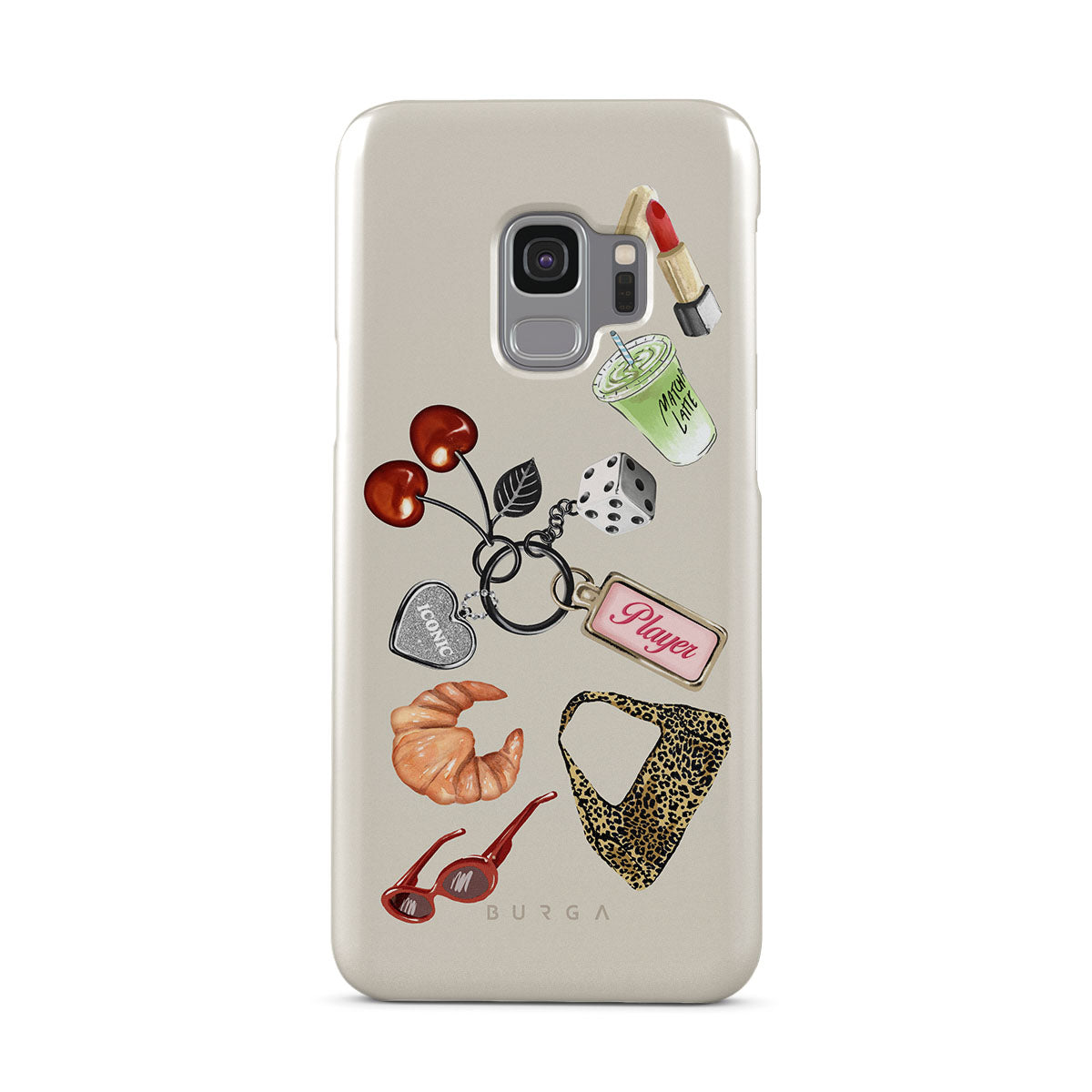 En este diseño: lentes de sol rojas, pintalabios rojo, bebida de matcha verde, croissant, dados negros, bolso de estampado de leopardo, llavero con corazón plateado, cerezas, dados y etiqueta "Player".