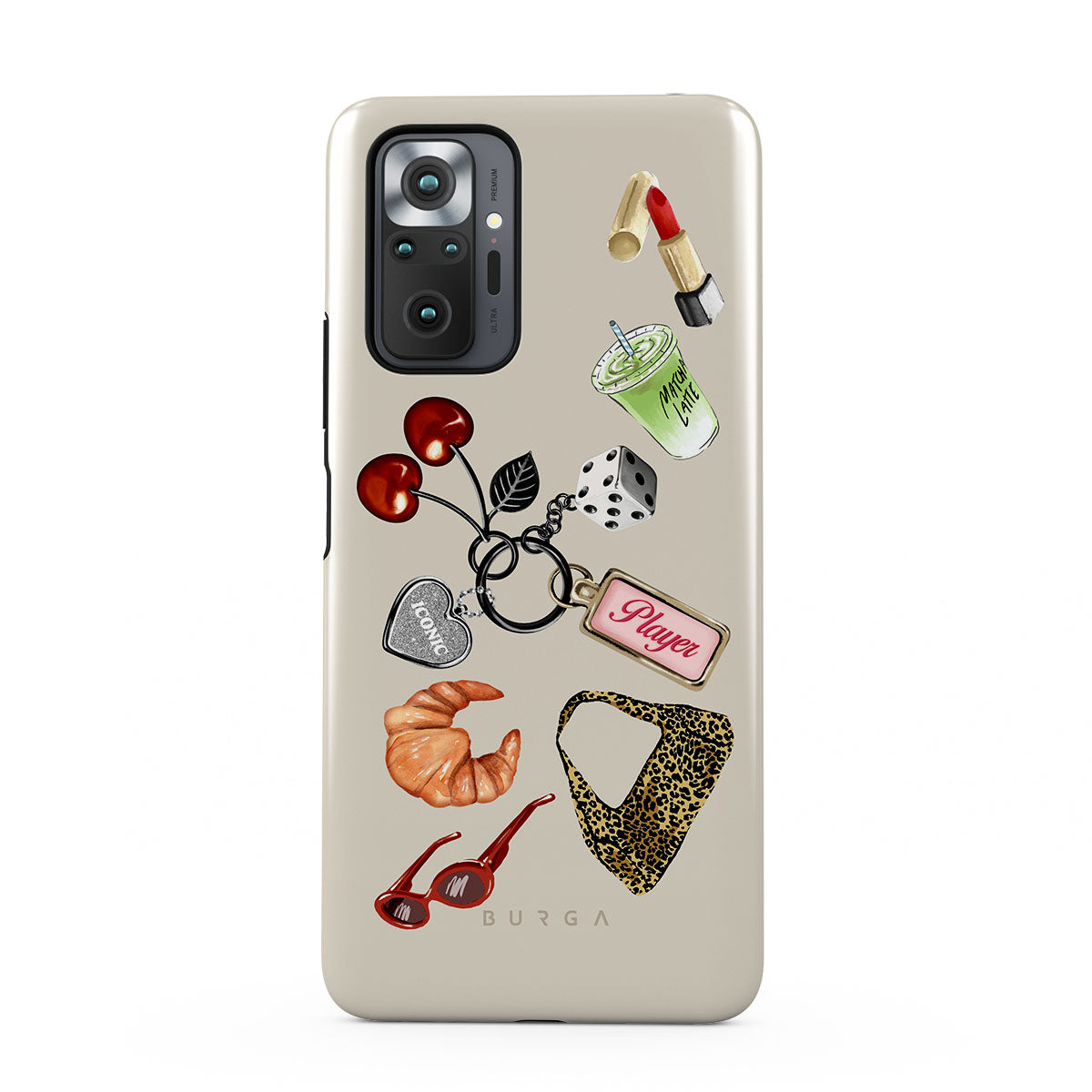 En este diseño: lentes de sol rojas, pintalabios rojo, bebida de matcha verde, croissant, dados negros, bolso de estampado de leopardo, llavero con corazón plateado, cerezas, dados y etiqueta "Player".