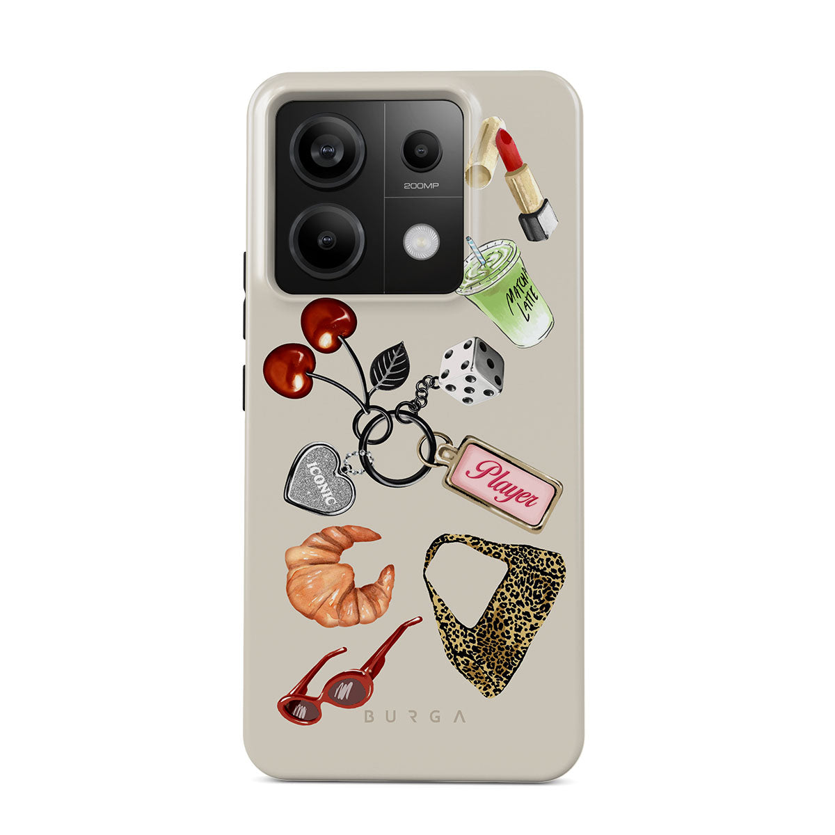 En este diseño: lentes de sol rojas, pintalabios rojo, bebida de matcha verde, croissant, dados negros, bolso de estampado de leopardo, llavero con corazón plateado, cerezas, dados y etiqueta "Player".