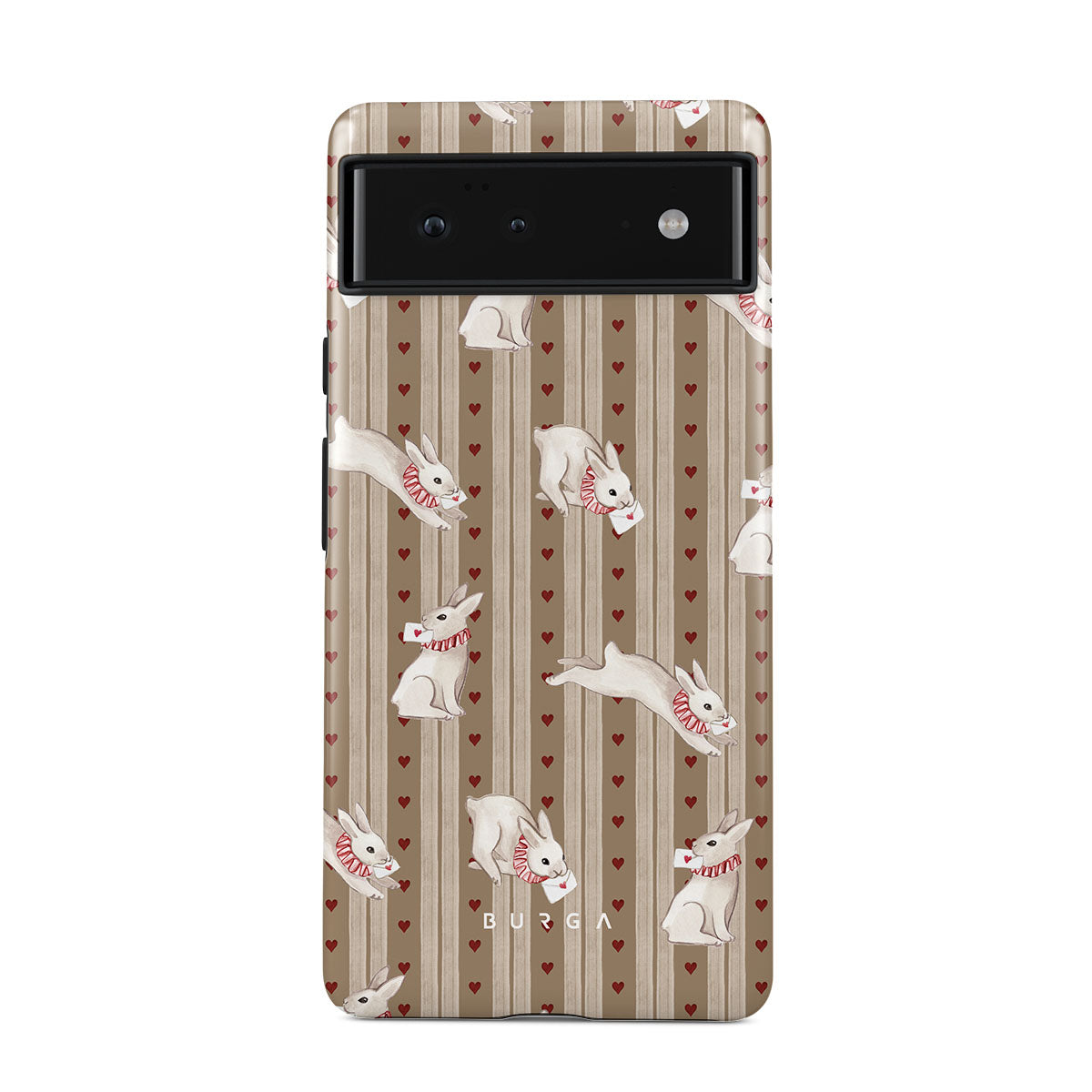En este diseño: conejos blancos, corazones, amor, cartas, rayas vintage.