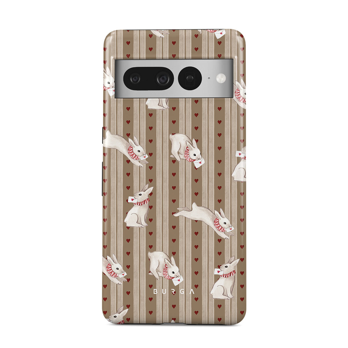 En este diseño: conejos blancos, corazones, amor, cartas, rayas vintage.