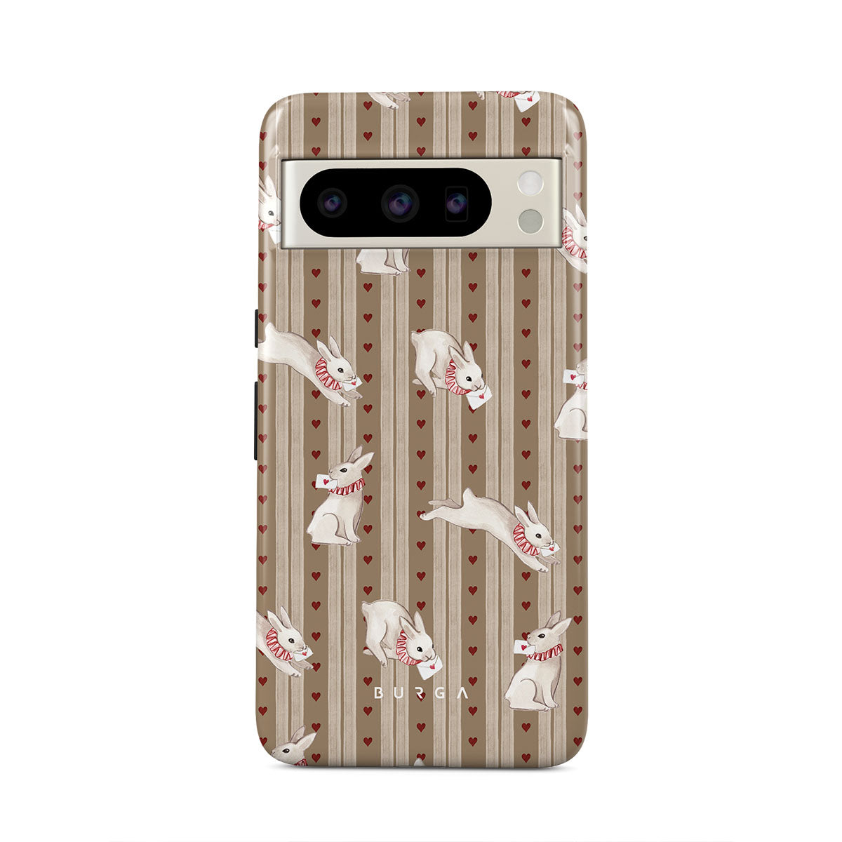 En este diseño: conejos blancos, corazones, amor, cartas, rayas vintage.