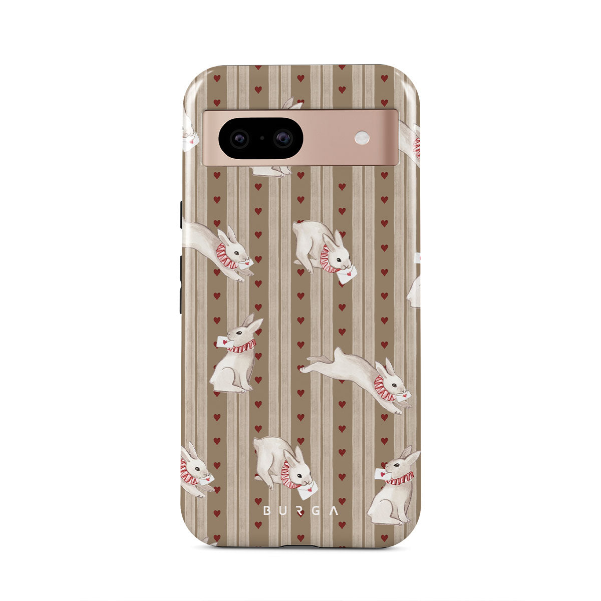 En este diseño: conejos blancos, corazones, amor, cartas, rayas vintage.