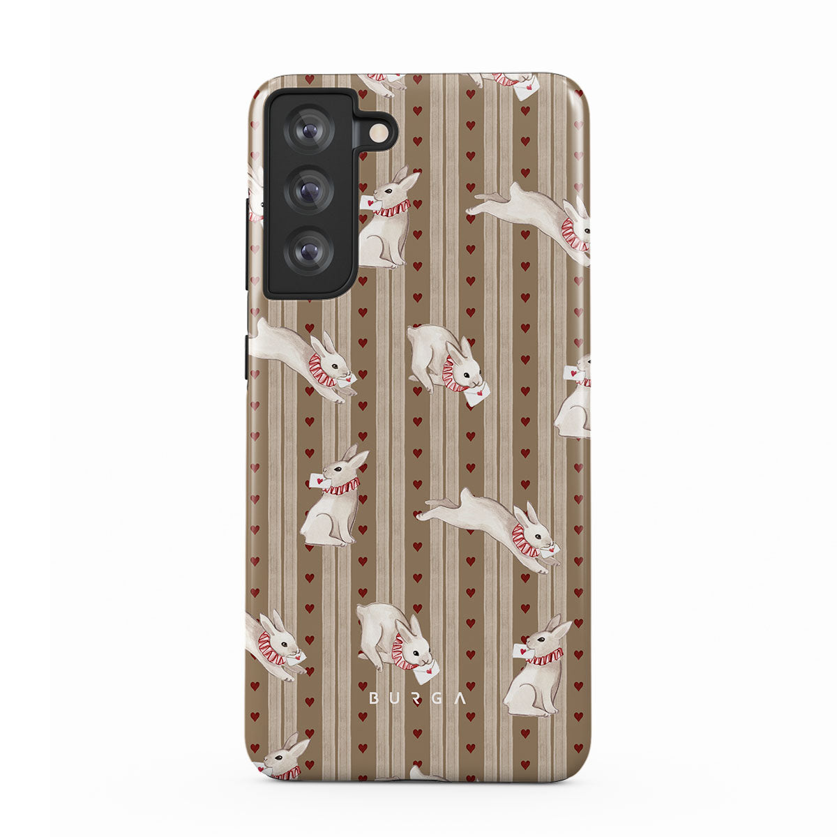 En este diseño: conejos blancos, corazones, amor, cartas, rayas vintage.
