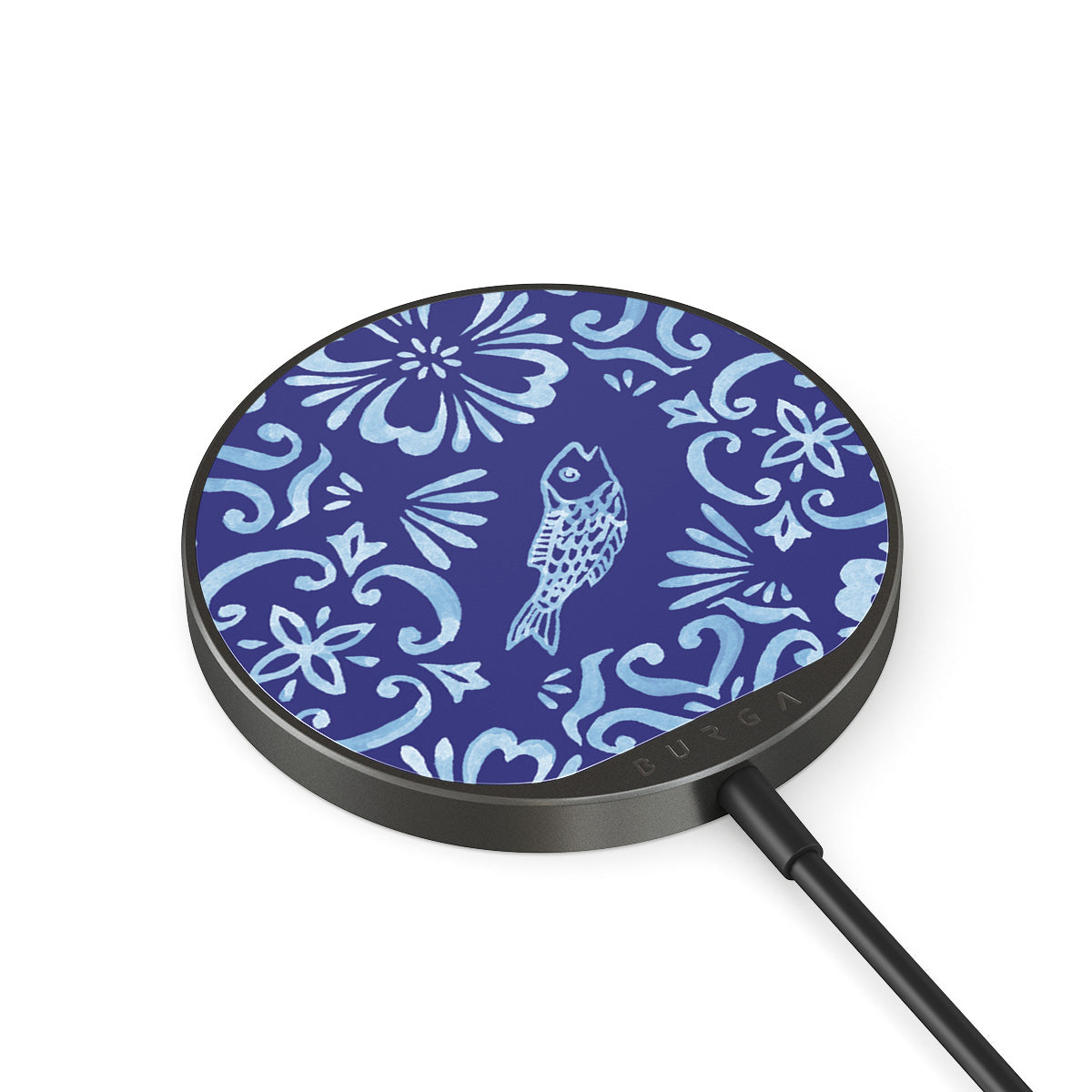En este diseño: patrones de azulejos portugueses, azules profundos, patrones florales, flores, peces
