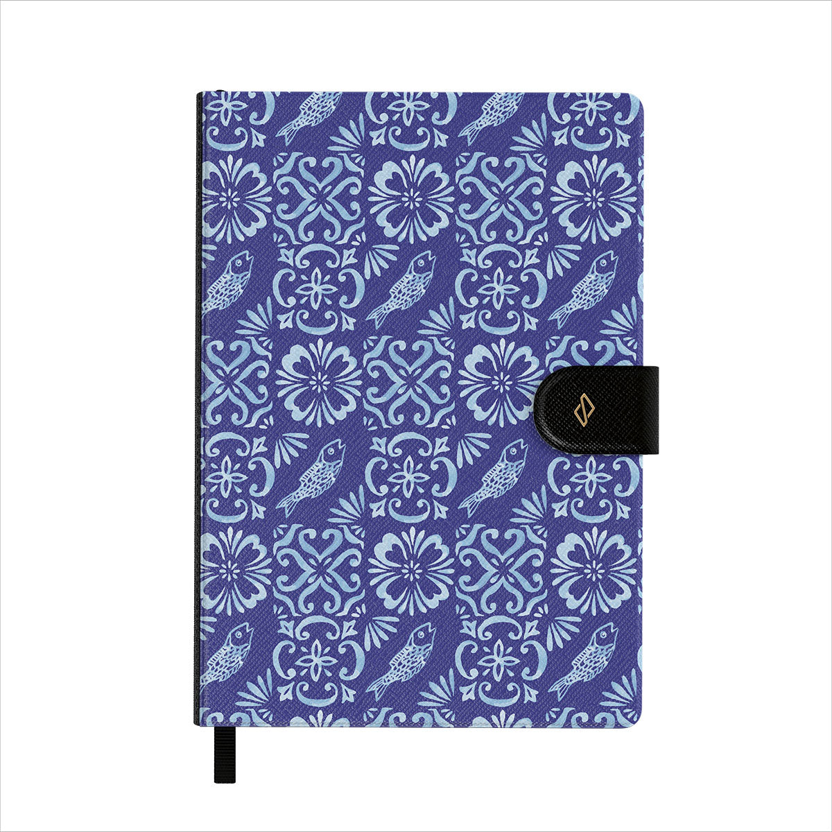 En este diseño: patrones de azulejos portugueses, azules profundos, patrones florales, flores, peces
