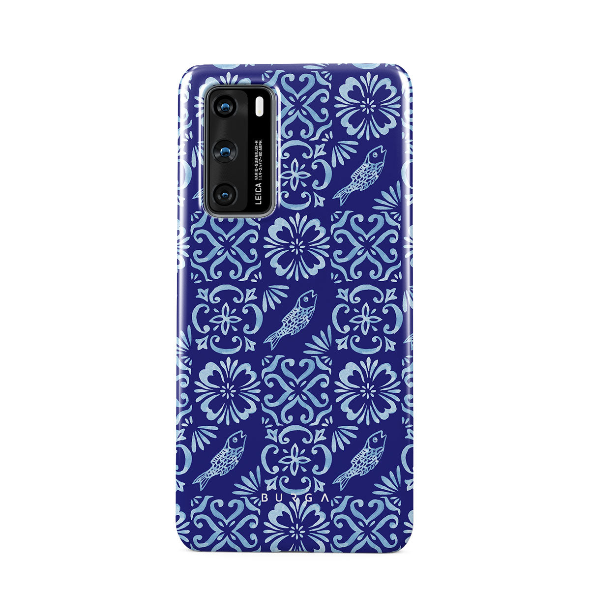 En este diseño: patrones de azulejos portugueses, azules profundos, patrones florales, flores, peces