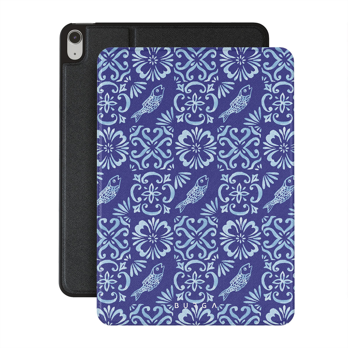 En este diseño: patrones de azulejos portugueses, azules profundos, patrones florales, flores, peces