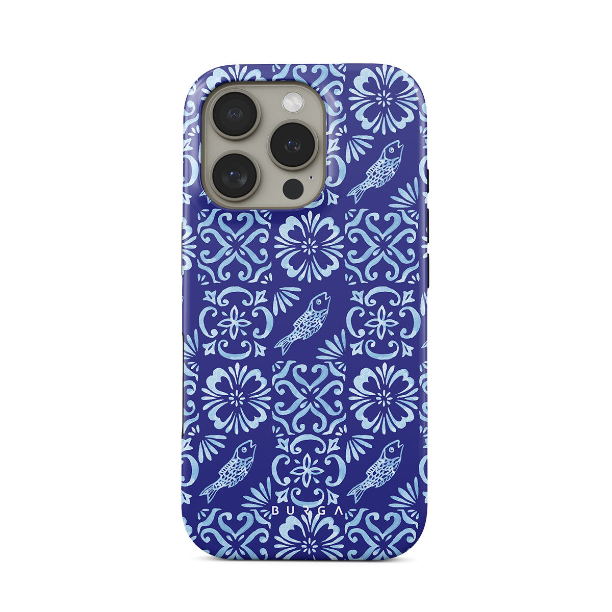 En este diseño: patrones de azulejos portugueses, azules profundos, patrones florales, flores, peces