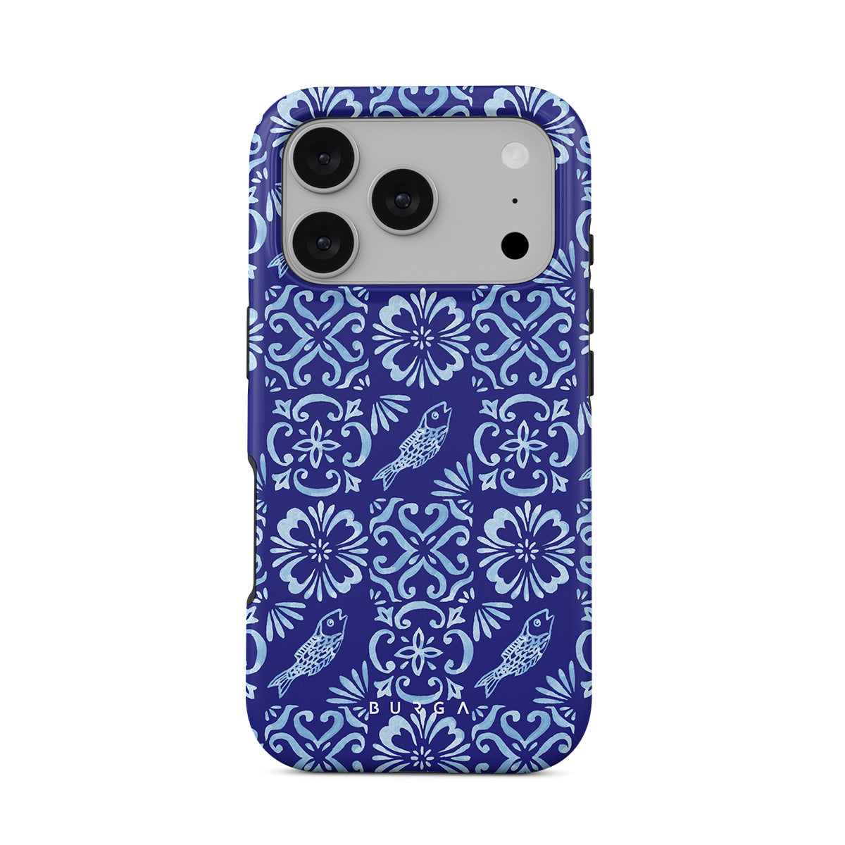 En este diseño: patrones de azulejos portugueses, azules profundos, patrones florales, flores, peces