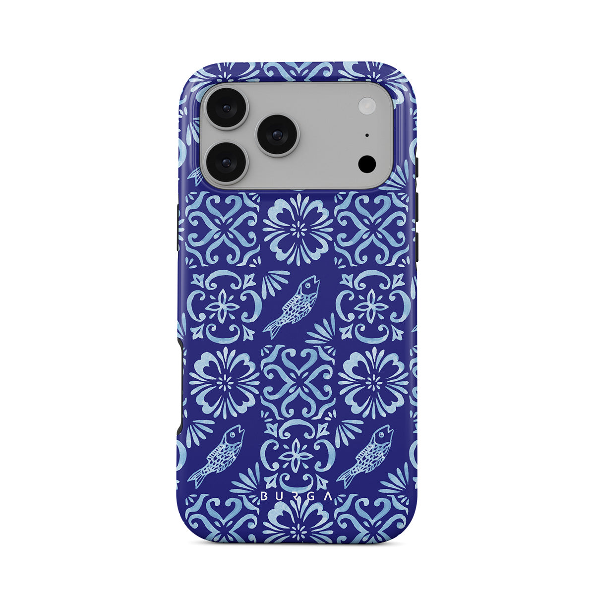 En este diseño: patrones de azulejos portugueses, azules profundos, patrones florales, flores, peces