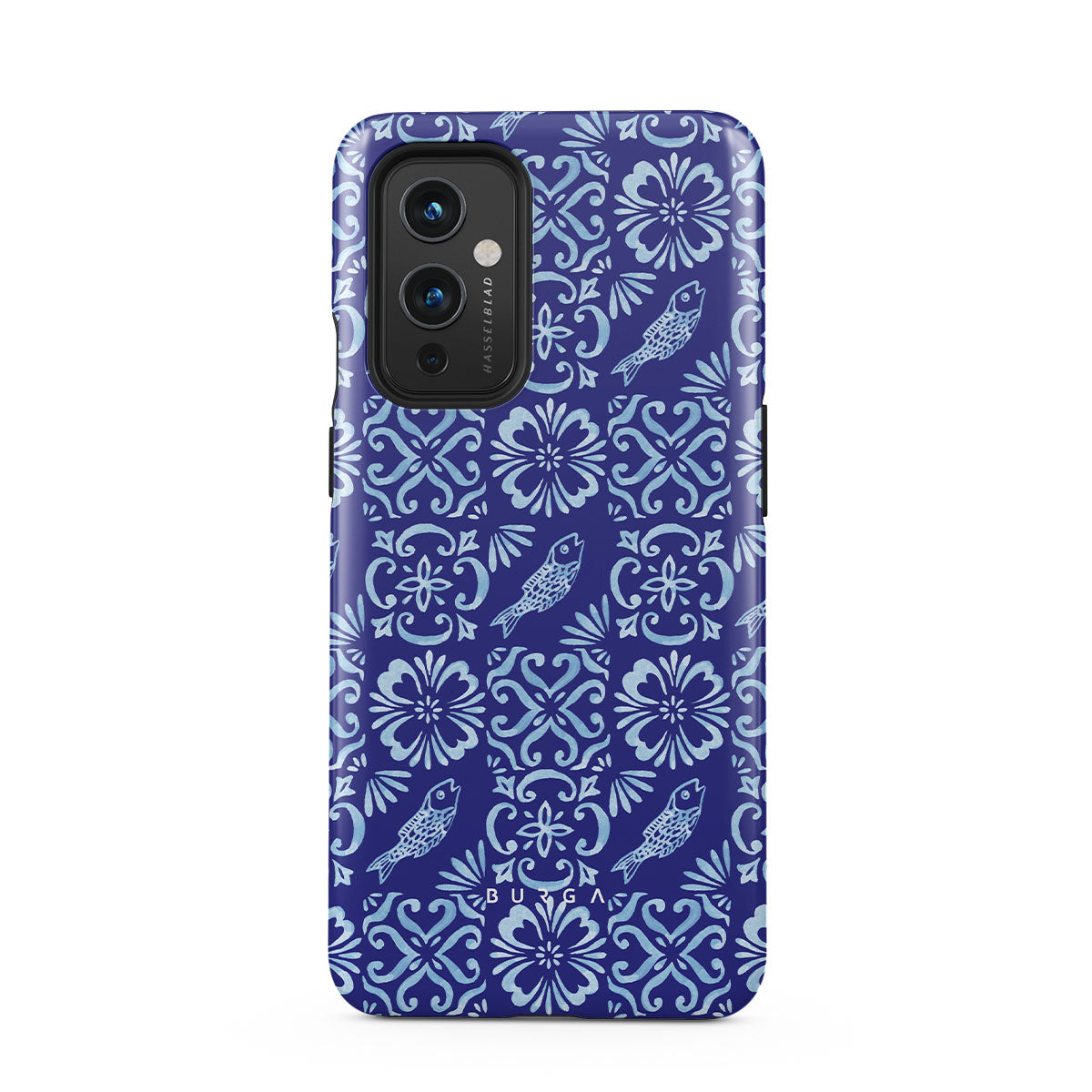 En este diseño: patrones de azulejos portugueses, azules profundos, patrones florales, flores, peces