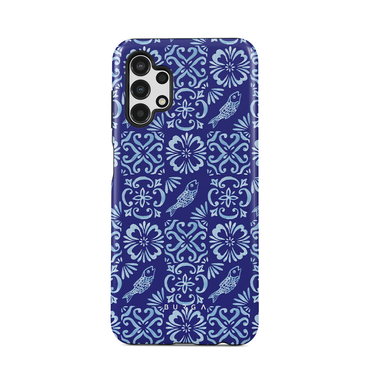 En este diseño: patrones de azulejos portugueses, azules profundos, patrones florales, flores, peces