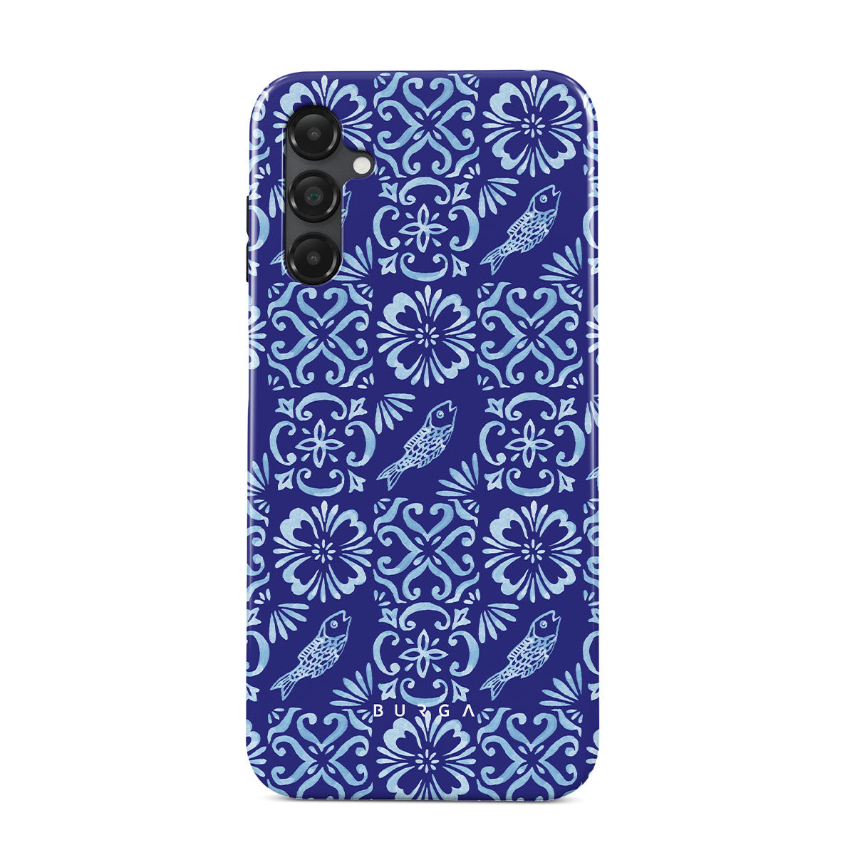 En este diseño: patrones de azulejos portugueses, azules profundos, patrones florales, flores, peces