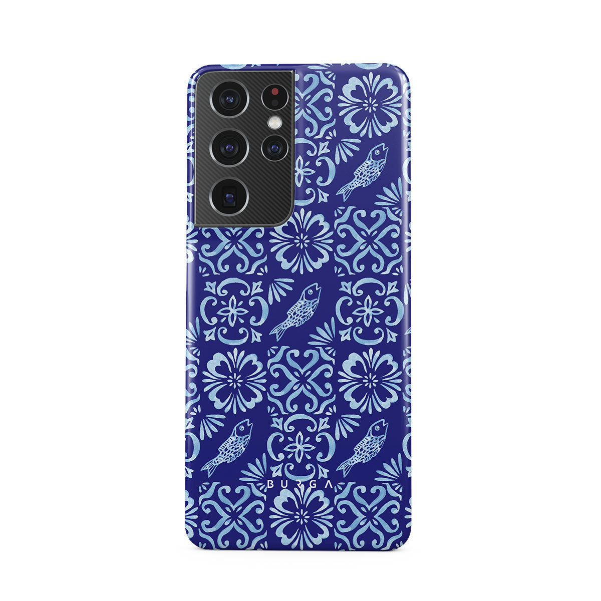 En este diseño: patrones de azulejos portugueses, azules profundos, patrones florales, flores, peces