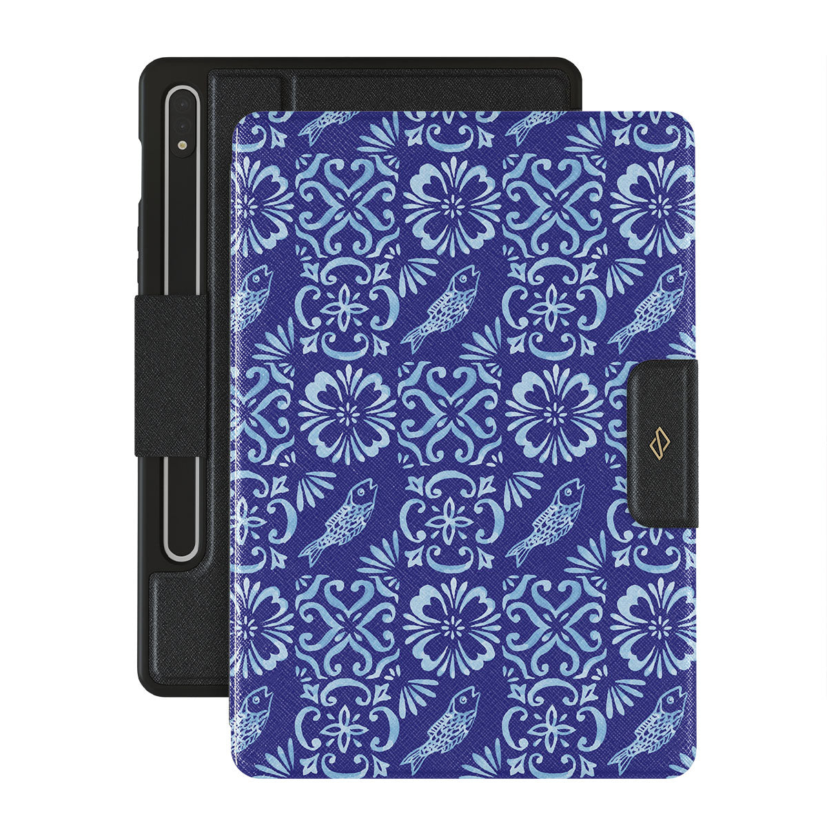 En este diseño: patrones de azulejos portugueses, azules profundos, patrones florales, flores, peces