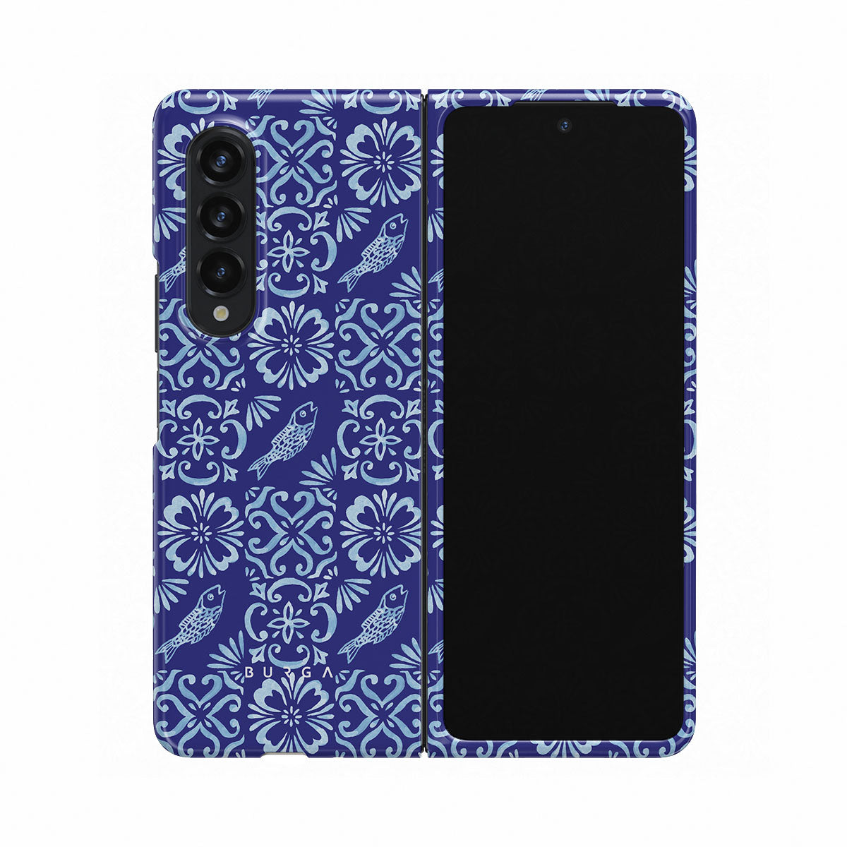 En este diseño: patrones de azulejos portugueses, azules profundos, patrones florales, flores, peces