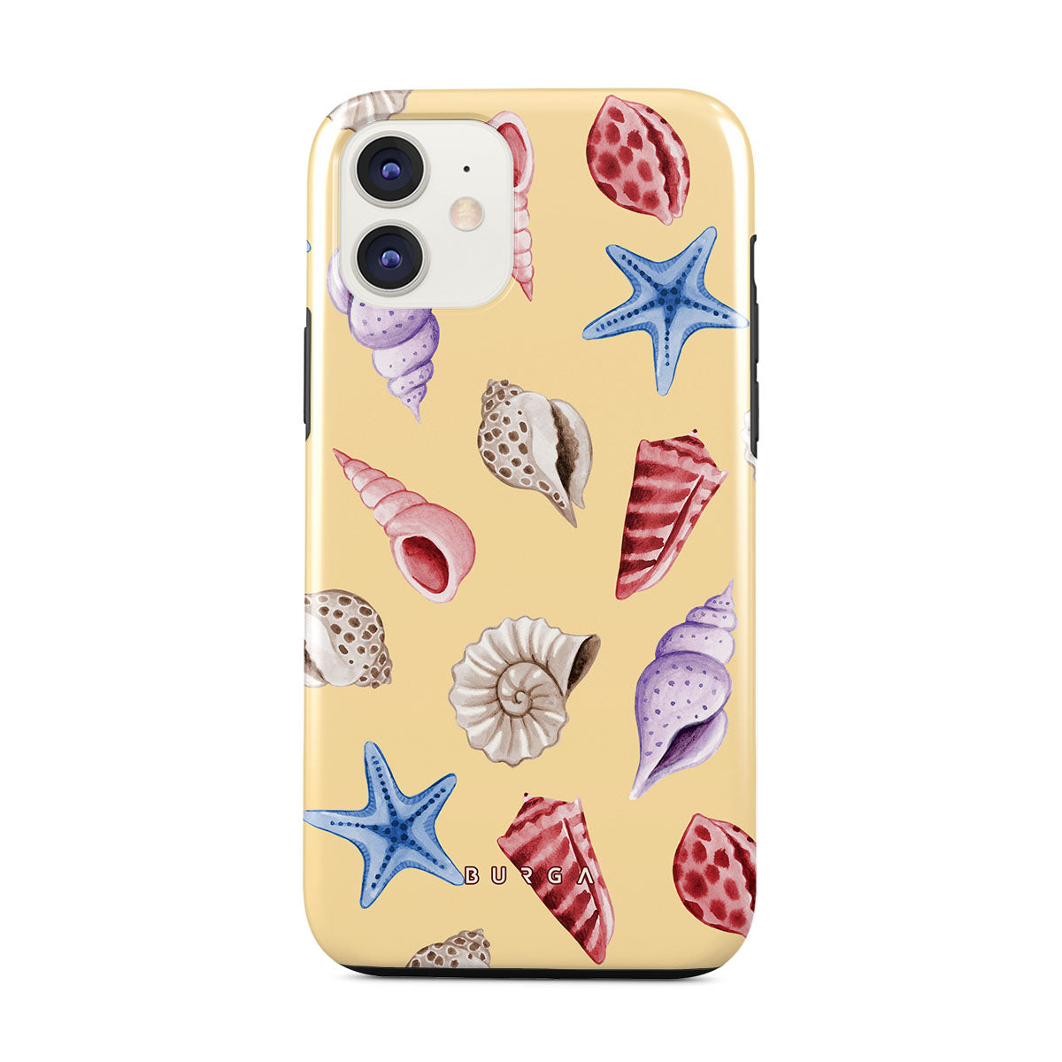 En este diseño: conchas, estrellas de mar, fondo amarillo pastel, tema oceánico.