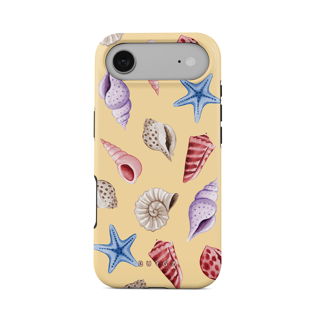 En este diseño: conchas, estrellas de mar, fondo amarillo pastel, tema oceánico.