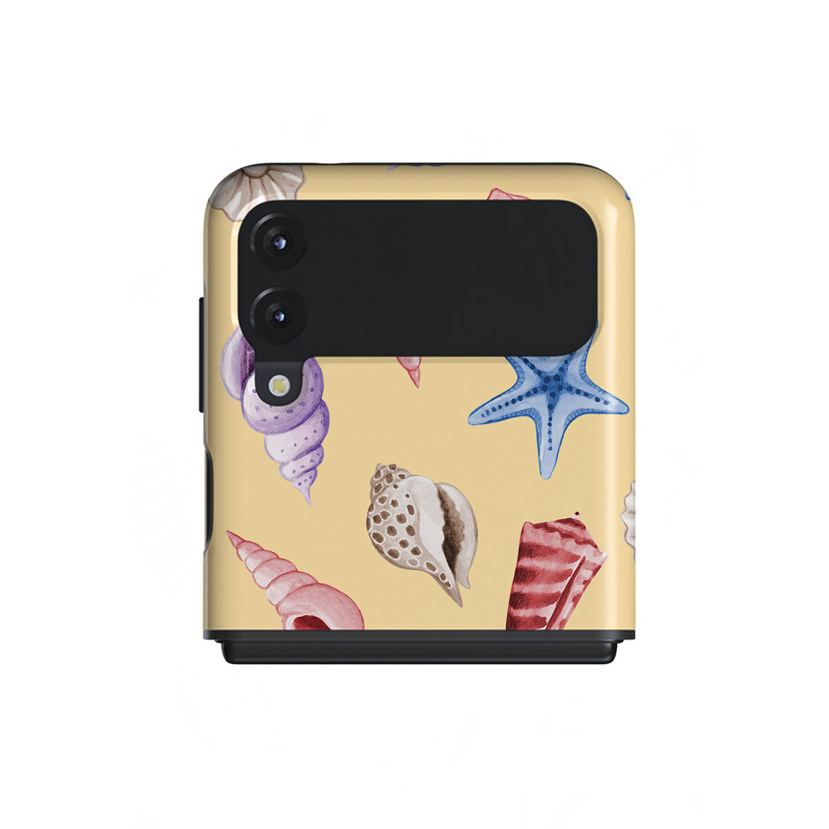 En este diseño: conchas, estrellas de mar, fondo amarillo pastel, tema oceánico.