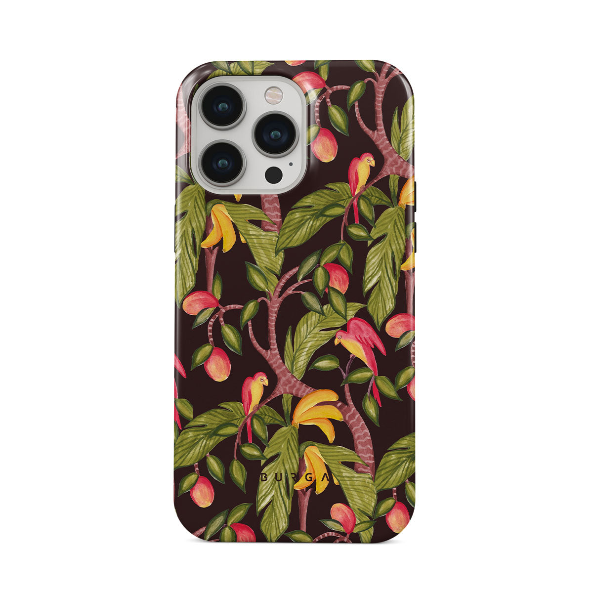 En este diseño: mangos, hojas verdes oscuras, patrón inspirado en la jungla