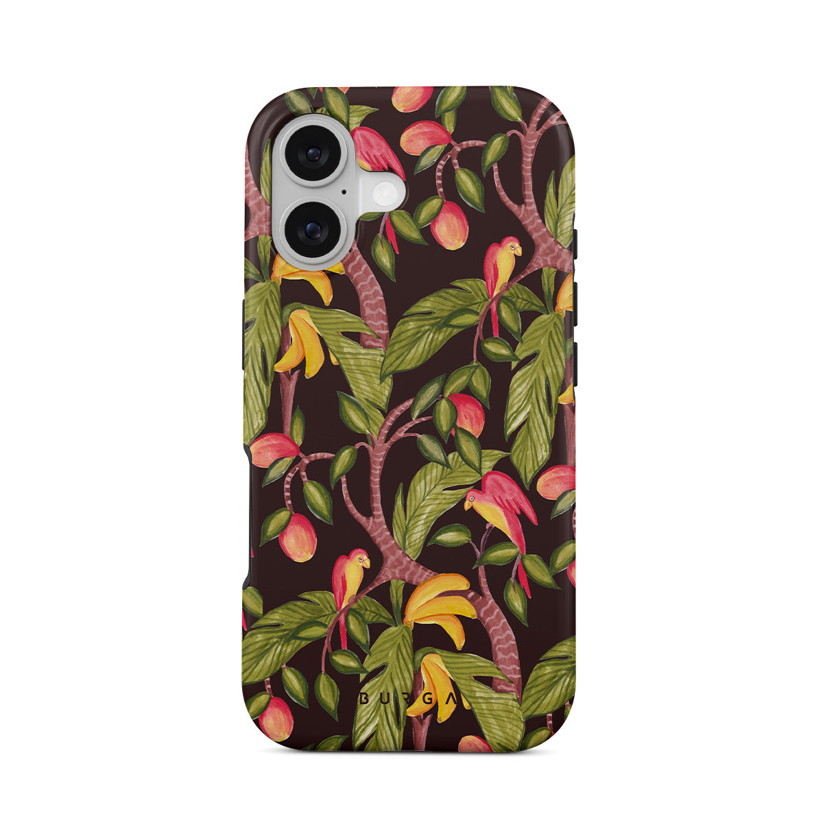 En este diseño: mangos, hojas verdes oscuras, patrón inspirado en la jungla