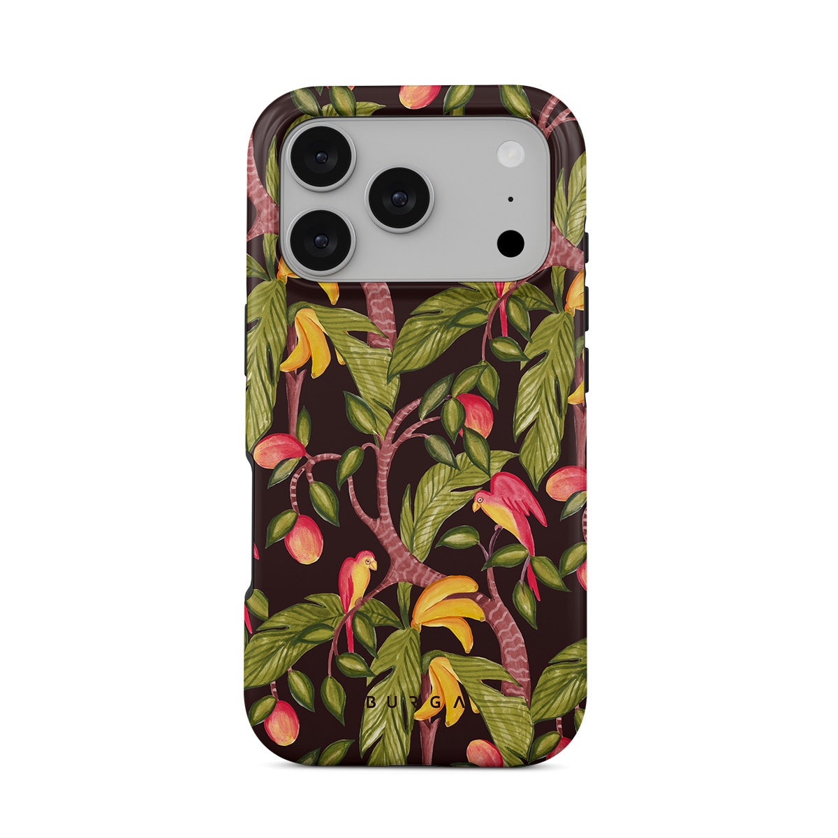 En este diseño: mangos, hojas verdes oscuras, patrón inspirado en la jungla