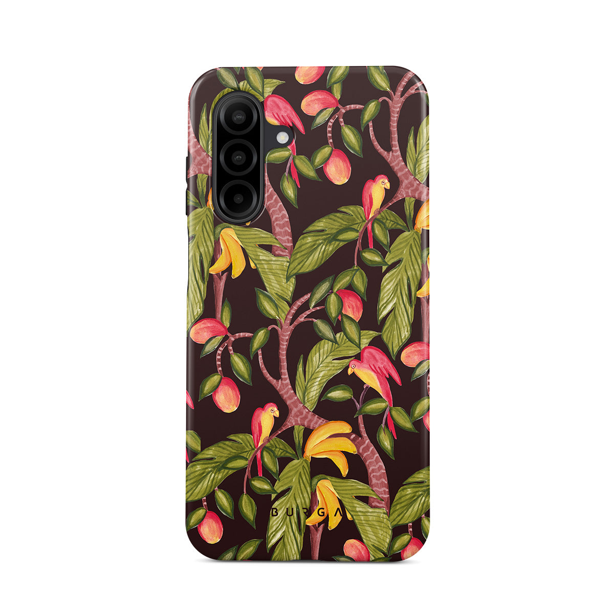 En este diseño: mangos, hojas verdes oscuras, patrón inspirado en la jungla