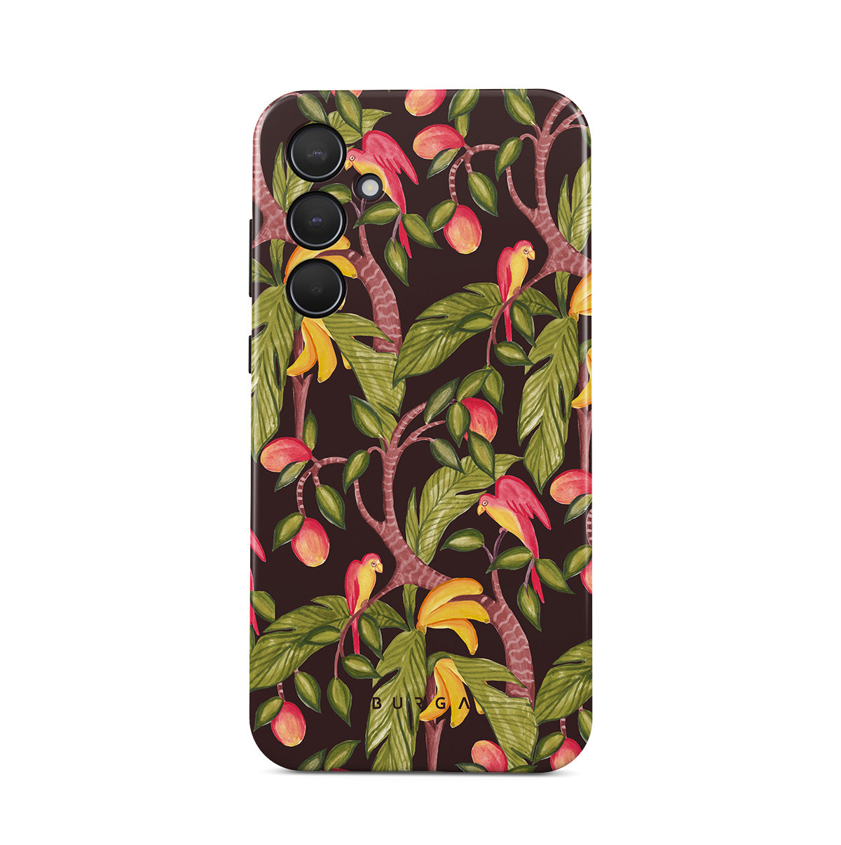 En este diseño: mangos, hojas verdes oscuras, patrón inspirado en la jungla