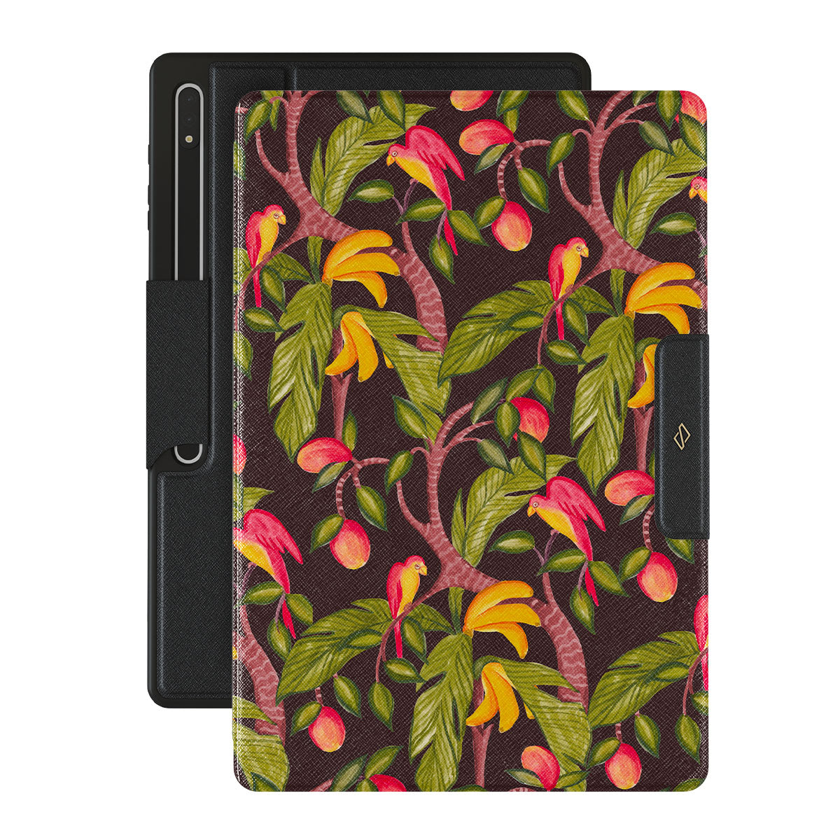 En este diseño: mangos, hojas verdes oscuras, patrón inspirado en la jungla