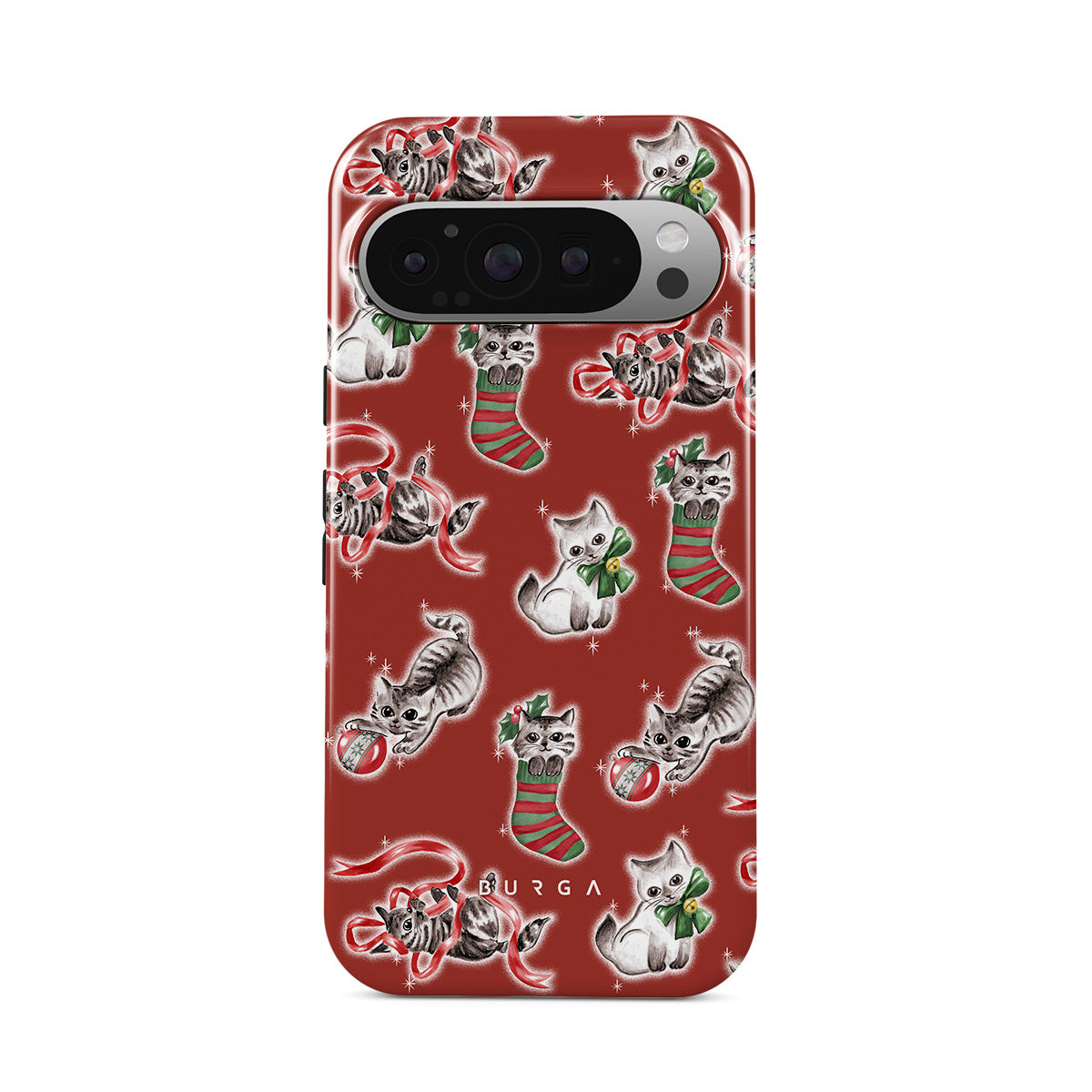 En este diseño: gatos, medias navideñas, gatitos, patrón rojo y verde, gatos juguetones, adornos navideños