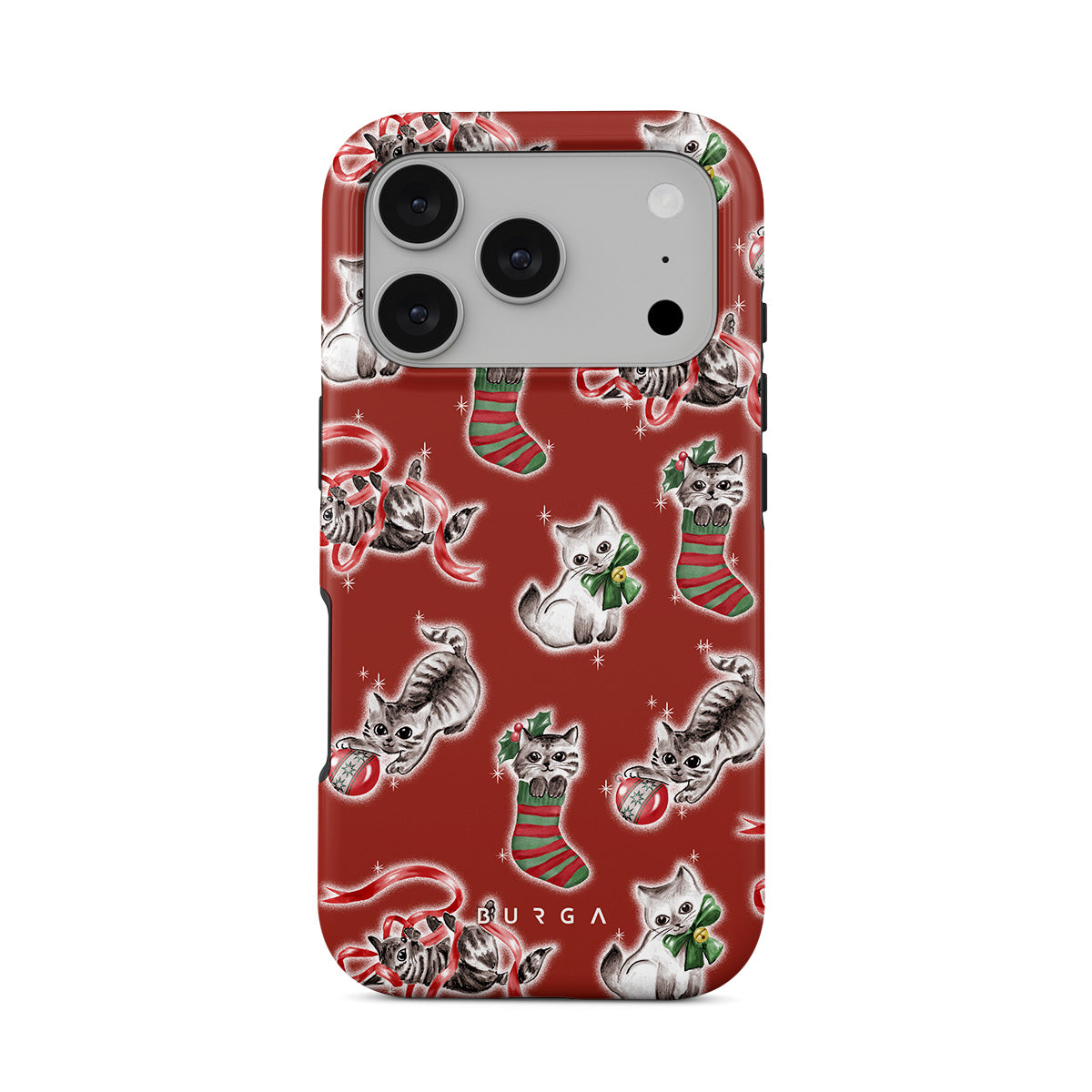 En este diseño: gatos, medias navideñas, gatitos, patrón rojo y verde, gatos juguetones, adornos navideños