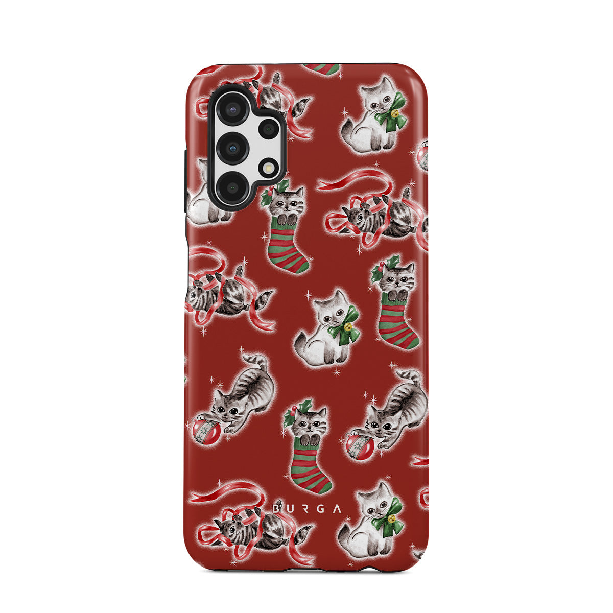 En este diseño: gatos, medias navideñas, gatitos, patrón rojo y verde, gatos juguetones, adornos navideños
