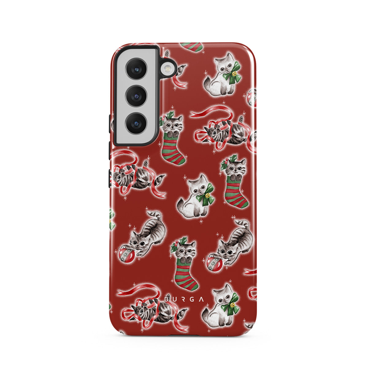 En este diseño: gatos, medias navideñas, gatitos, patrón rojo y verde, gatos juguetones, adornos navideños