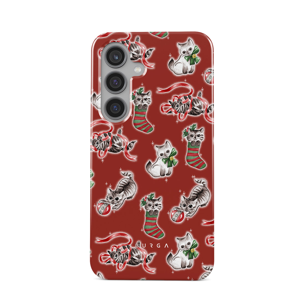 En este diseño: gatos, medias navideñas, gatitos, patrón rojo y verde, gatos juguetones, adornos navideños