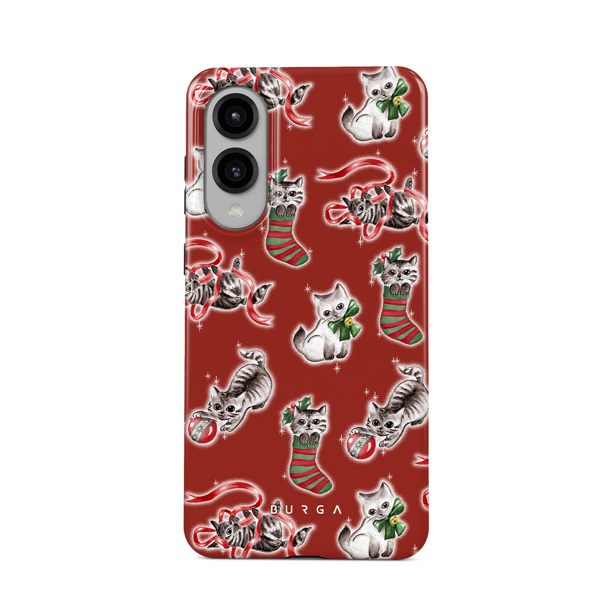 En este diseño: gatos, medias navideñas, gatitos, patrón rojo y verde, gatos juguetones, adornos navideños