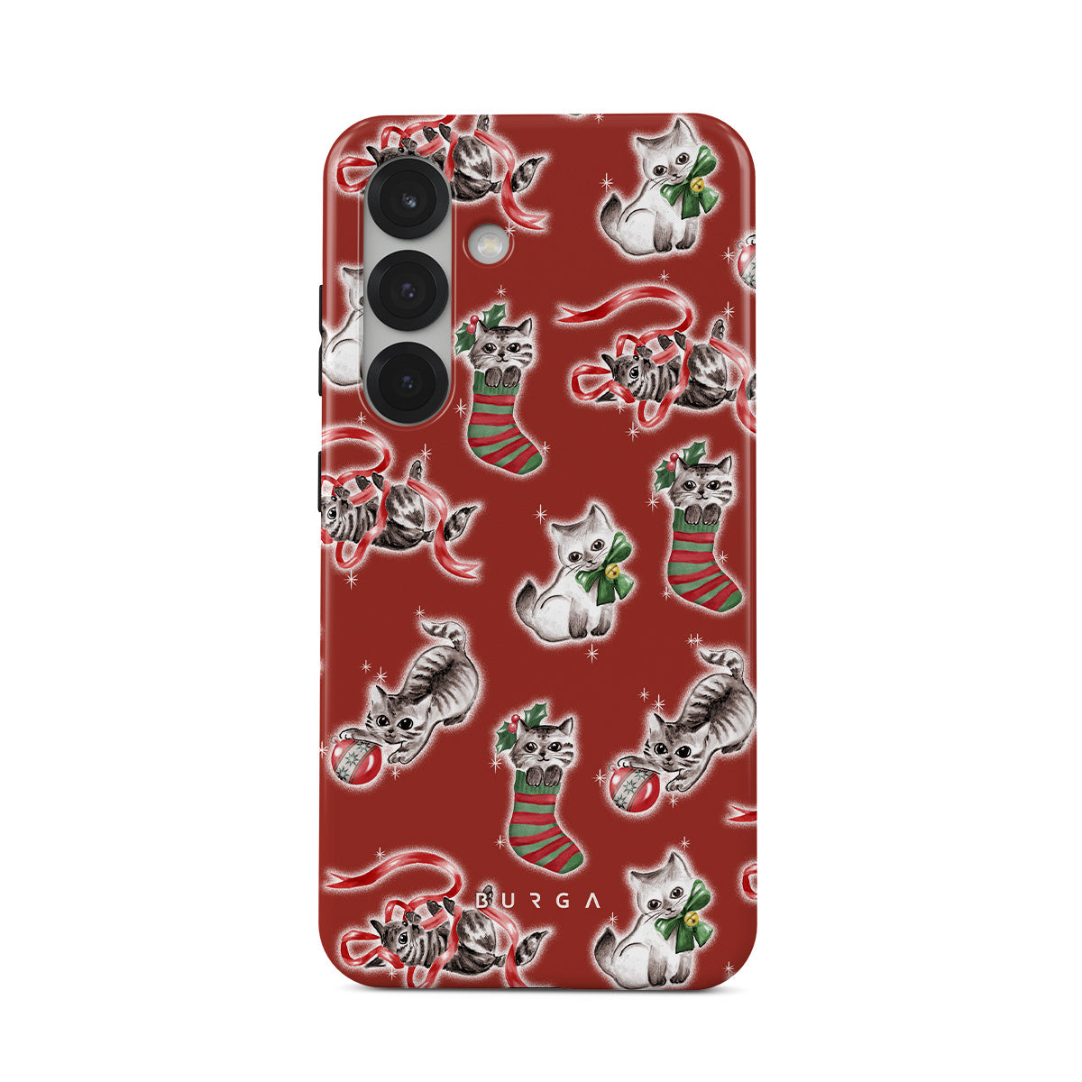 En este diseño: gatos, medias navideñas, gatitos, patrón rojo y verde, gatos juguetones, adornos navideños