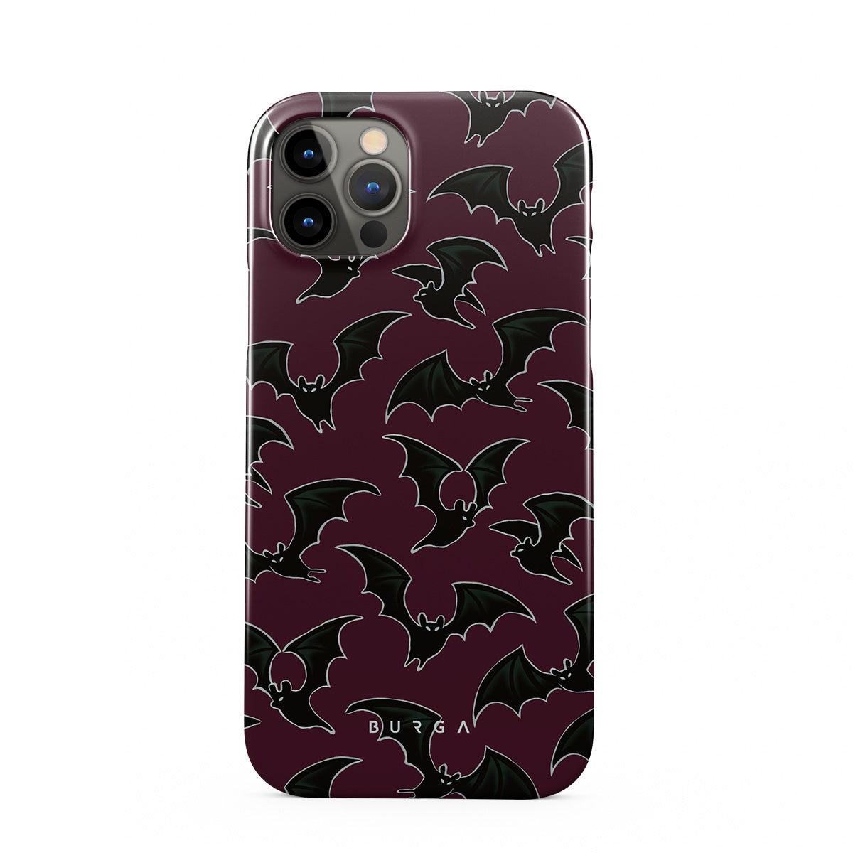 En este diseño: tema de Halloween, murciélagos, fondo burdeos
