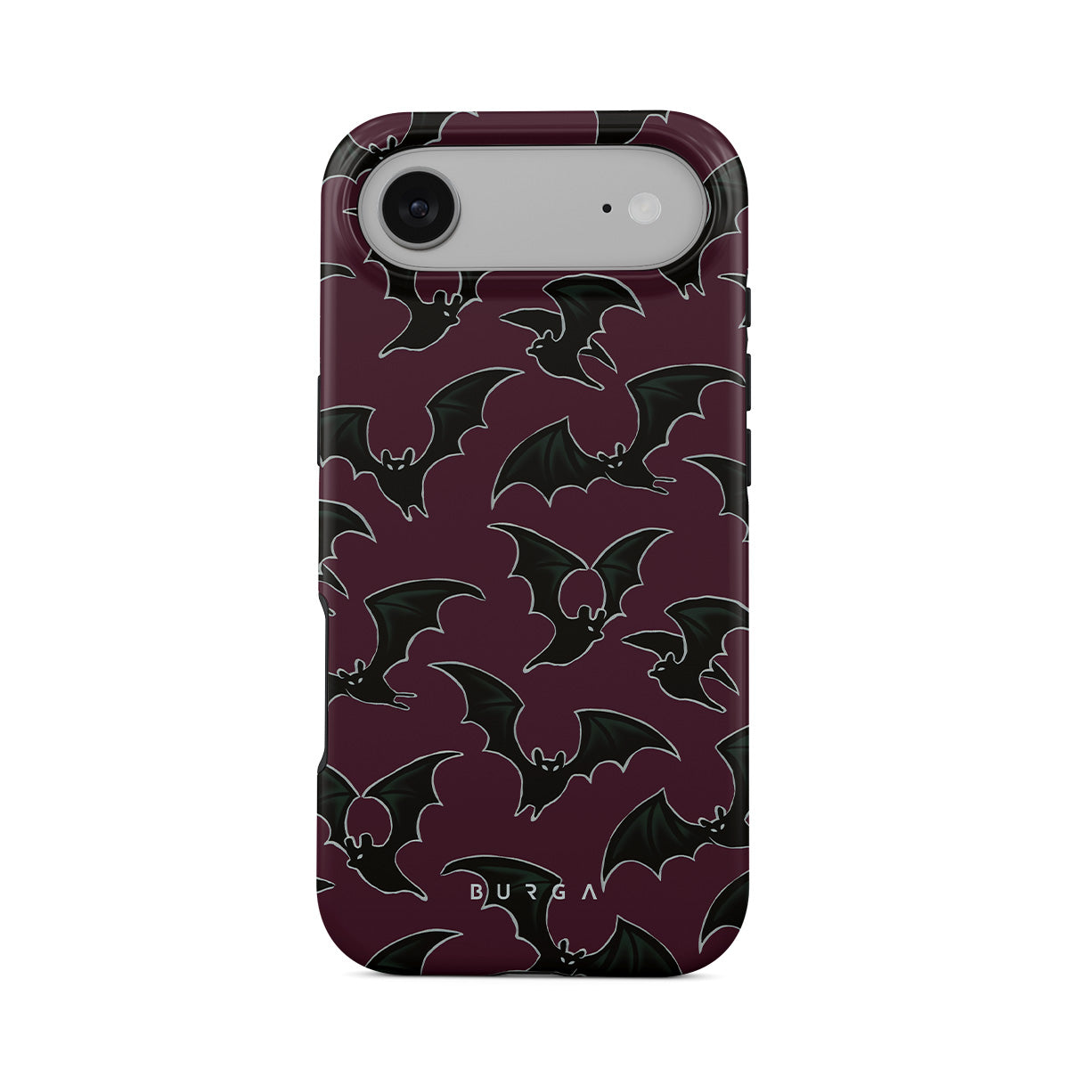 En este diseño: tema de Halloween, murciélagos, fondo burdeos