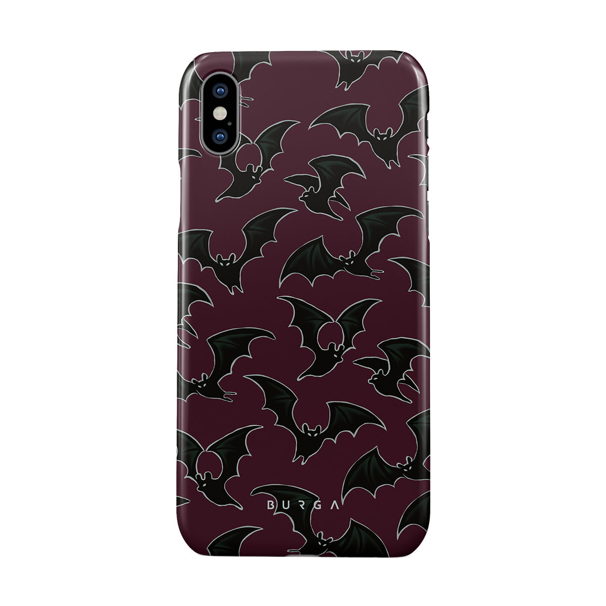 En este diseño: tema de Halloween, murciélagos, fondo burdeos