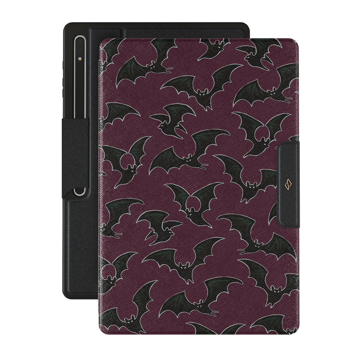 En este diseño: tema de Halloween, murciélagos, fondo burdeos