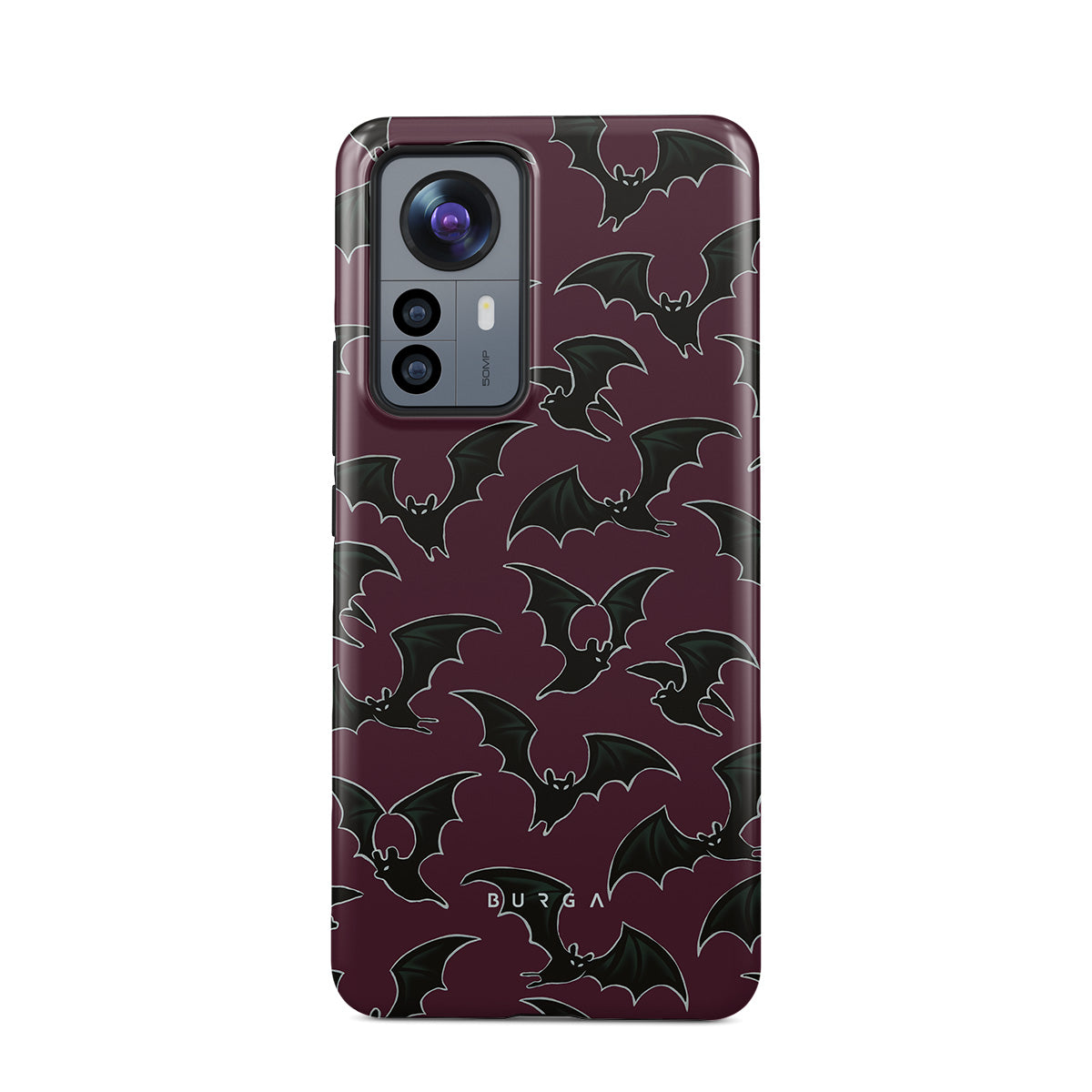 En este diseño: tema de Halloween, murciélagos, fondo burdeos